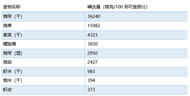 当然,即使同一类食物如含碘较高的食物中,不同的食物含碘量还是存在一定差异的。表中所有的数值均为 100克 食物中可食用部分所含有的碘量(微克),表中按食物含碘量的高低做了排序。