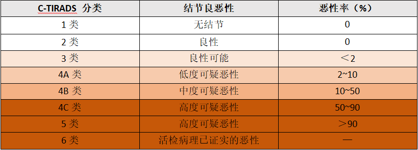 甲状腺结节有很多种类,而且它们的超声图像也是各有特点,所以超声医师会根据具体的甲状腺结节图像特征按照C-TIRADS(中国版甲状腺影像报告和数据系统分级)的分级标准进行分类,级别越高,说明结节恶性的可能性越大。
